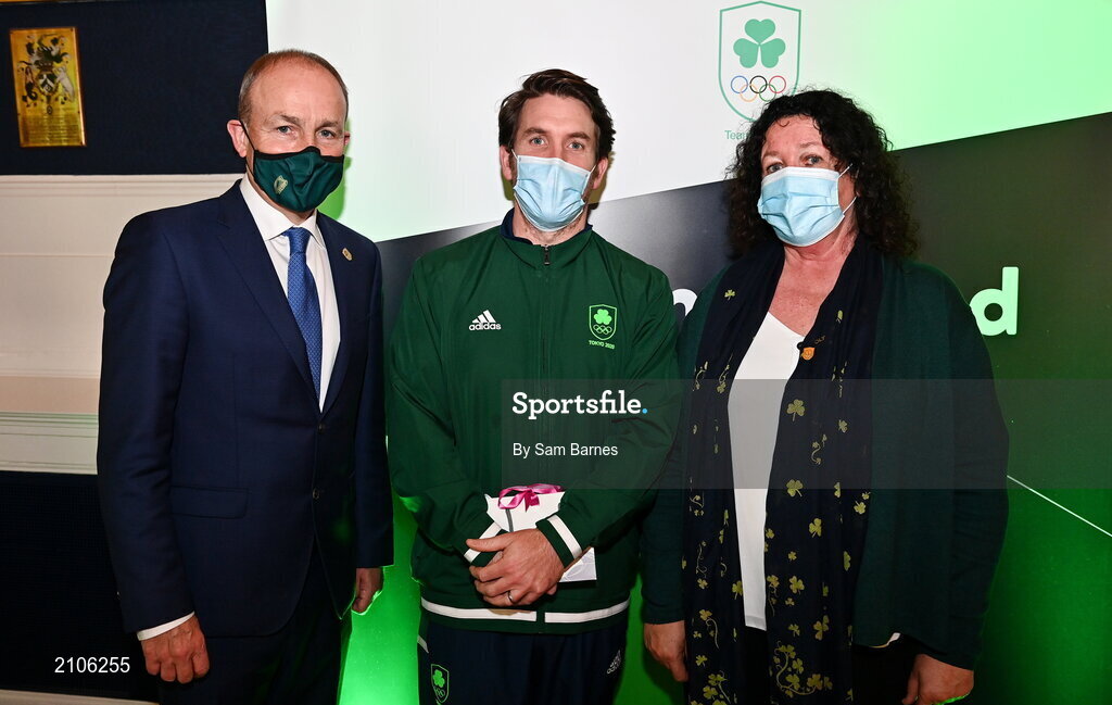 29 October 2021; The athletes and staff who represented Team Ireland at Tokyo 2020 this summer were formally congratulated at the Official Team Ireland Homecoming in Dublin Castle. A record number of Irish athletes competed at the Summer Olympics in Japan with 116 athletes competing across nineteen sports. An Taoiseach Michéal Martin TD, Minister Catherine Martin TD, Minister of State Jack Chambers TD and His Excellency Ambassador Extraordinary and Plenipotentiary of Japan to Ireland, Mr Mitsuru Kitano attended the event to honour the athletes. Pictured is An Taoiseach Micheál Martin TD with Team Ireland Tokyo 2020 Chef de Mission Patricia Heberle and Team Ireland support staff member Eamonn Flanagan. Photo by Sam Barnes/Sportsfile