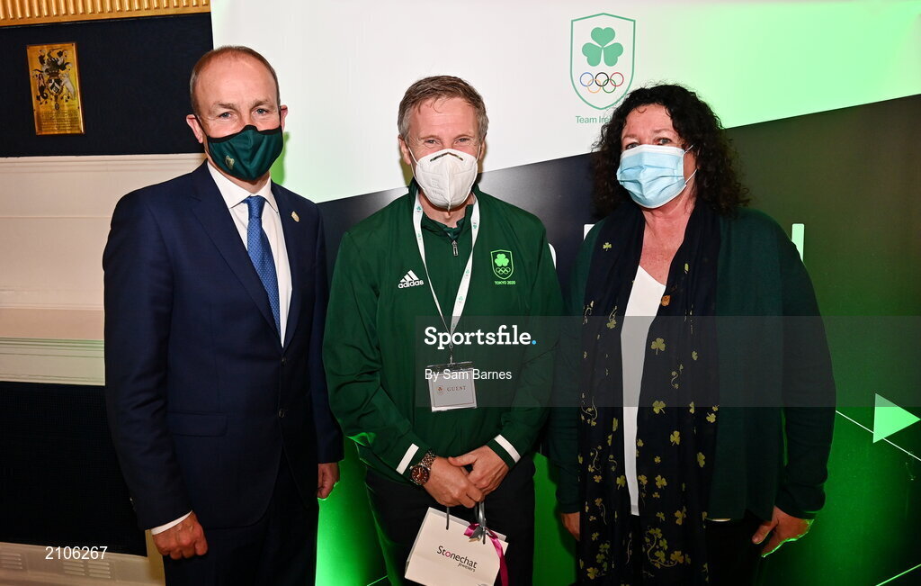 29 October 2021; The athletes and staff who represented Team Ireland at Tokyo 2020 this summer were formally congratulated at the Official Team Ireland Homecoming in Dublin Castle. A record number of Irish athletes competed at the Summer Olympics in Japan with 116 athletes competing across nineteen sports. An Taoiseach Michéal Martin TD, Minister Catherine Martin TD, Minister of State Jack Chambers TD and His Excellency Ambassador Extraordinary and Plenipotentiary of Japan to Ireland, Mr Mitsuru Kitano attended the event to honour the athletes. Pictured is An Taoiseach Micheál Martin TD with Team Ireland Tokyo 2020 Chef de Mission Patricia Heberle and Team Ireland support staff member Feargal O'Callaghan. Photo by Sam Barnes/Sportsfile