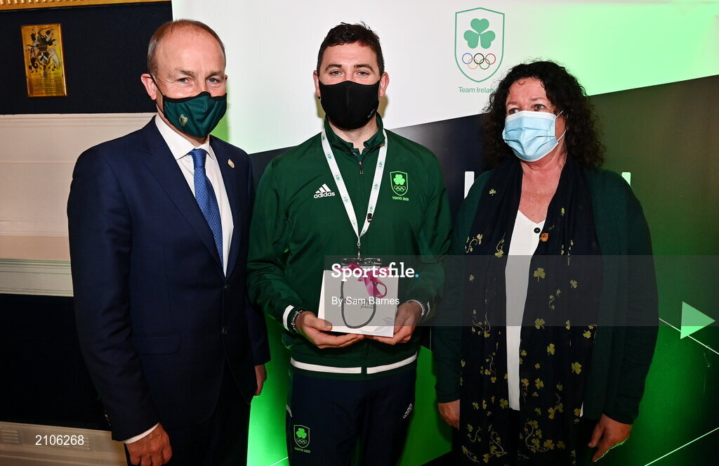 29 October 2021; The athletes and staff who represented Team Ireland at Tokyo 2020 this summer were formally congratulated at the Official Team Ireland Homecoming in Dublin Castle. A record number of Irish athletes competed at the Summer Olympics in Japan with 116 athletes competing across nineteen sports. An Taoiseach Michéal Martin TD, Minister Catherine Martin TD, Minister of State Jack Chambers TD and His Excellency Ambassador Extraordinary and Plenipotentiary of Japan to Ireland, Mr Mitsuru Kitano attended the event to honour the athletes. Pictured is An Taoiseach Micheál Martin TD with Team Ireland Tokyo 2020 Chef de Mission Patricia Heberle and Team Ireland support staff member Declan Monaghan. Photo by Sam Barnes/Sportsfile
