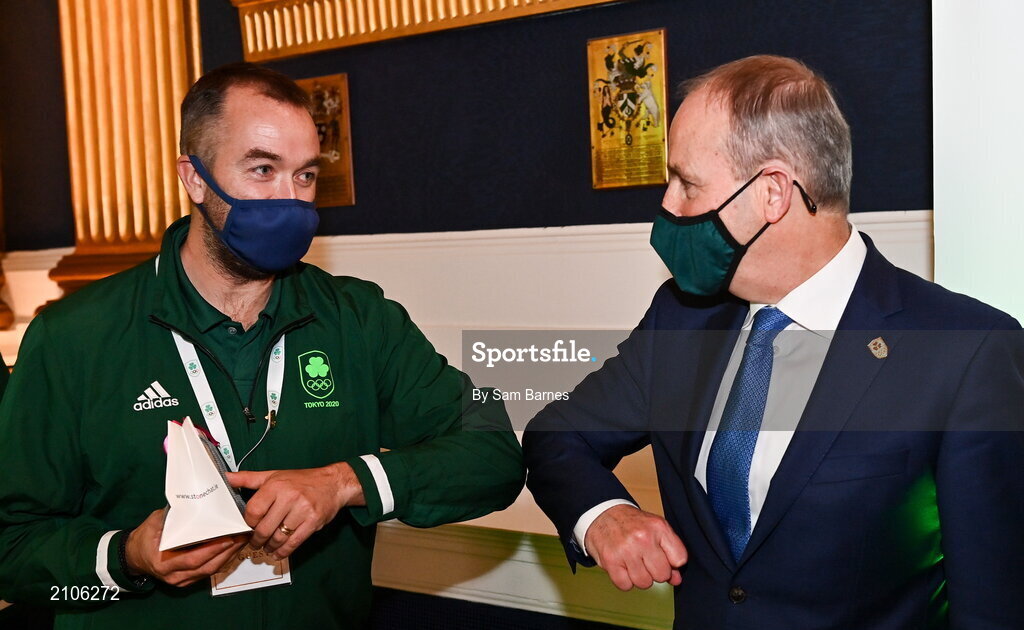 29 October 2021; The athletes and staff who represented Team Ireland at Tokyo 2020 this summer were formally congratulated at the Official Team Ireland Homecoming in Dublin Castle. A record number of Irish athletes competed at the Summer Olympics in Japan with 116 athletes competing across nineteen sports. An Taoiseach Michéal Martin TD, Minister Catherine Martin TD, Minister of State Jack Chambers TD and His Excellency Ambassador Extraordinary and Plenipotentiary of Japan to Ireland, Mr Mitsuru Kitano attended the event to honour the athletes. Pictured is An Taoiseach Micheál Martin TD with Team Ireland support staff member Shane McCormack. Photo by Sam Barnes/Sportsfile