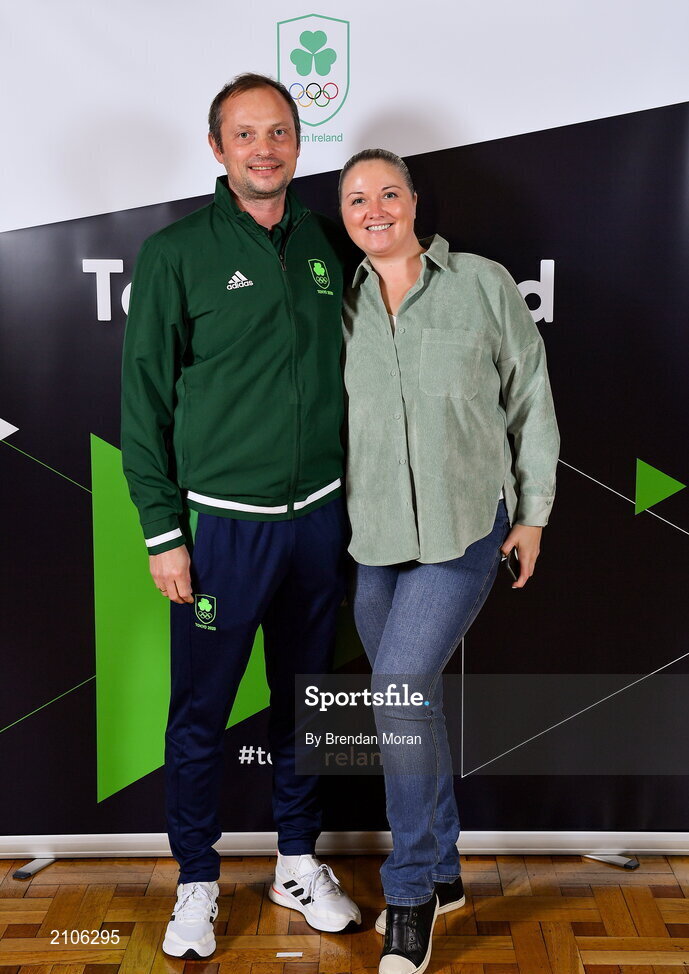 29 October 2021; The athletes and staff who represented Team Ireland at Tokyo 2020 this summer were formally congratulated at the Official Team Ireland Homecoming in Dublin Castle. A record number of Irish athletes competed at the Summer Olympics in Japan with 116 athletes competing across nineteen sports. An Taoiseach Michéal Martin TD, Minister Catherine Martin TD, Minister of State Jack Chambers TD and His Excellency Ambassador Extraordinary and Plenipotentiary of Japan to Ireland, Mr Mitsuru Kitano attended the event to honour the athletes. In attendance at the homecoming is Team Ireland modern pentathlon coach Andrei Fedotov and his wife Irina. Photo by Brendan Moran/Sportsfile