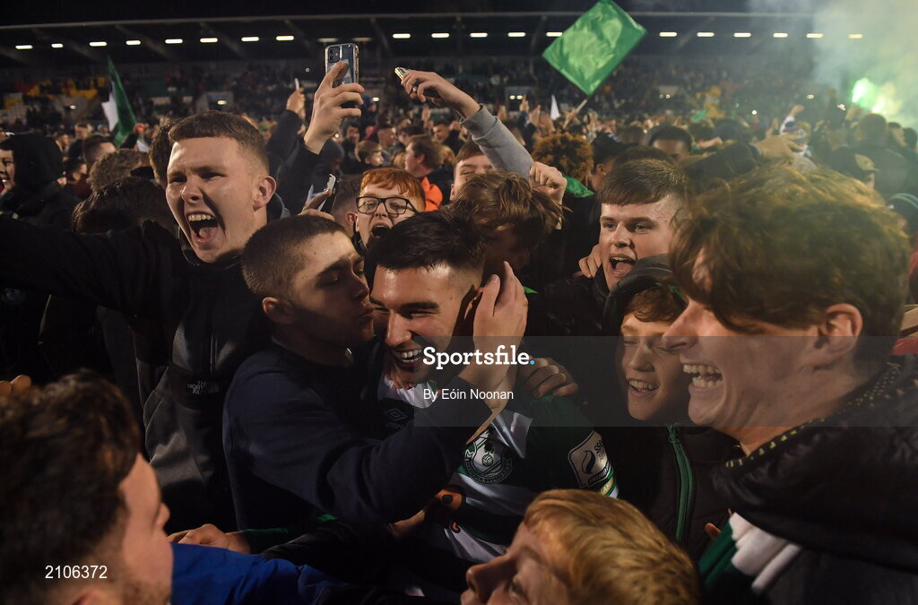 29 October 2021; Danny Mandroiu of Shamrock Rovers, centre, celebrates with supporters after the SSE Airtricity League Premier Division match between Shamrock Rovers and Finn Harps at Tallaght Stadium in Dublin. Photo by Eóin Noonan/Sportsfile