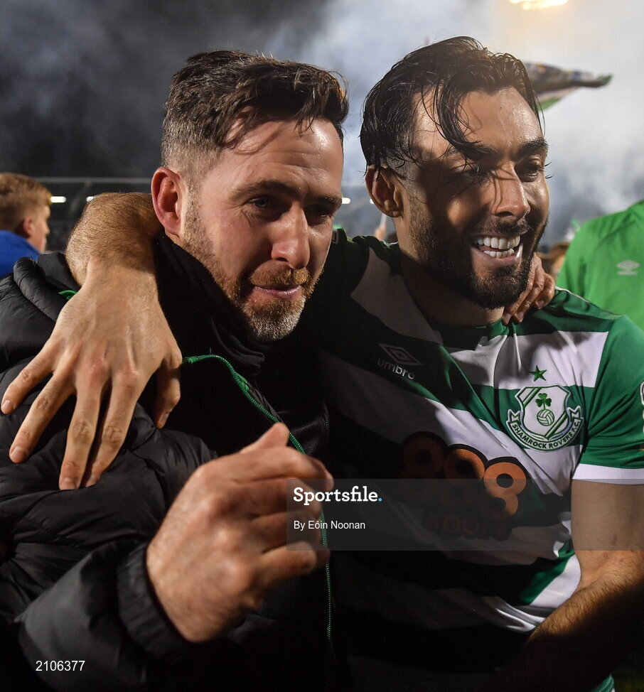 29 October 2021; Shamrock Rovers manager Stephen Bradley, left, and Richie Towell celebrate after the SSE Airtricity League Premier Division match between Shamrock Rovers and Finn Harps at Tallaght Stadium in Dublin. Photo by Eóin Noonan/Sportsfile