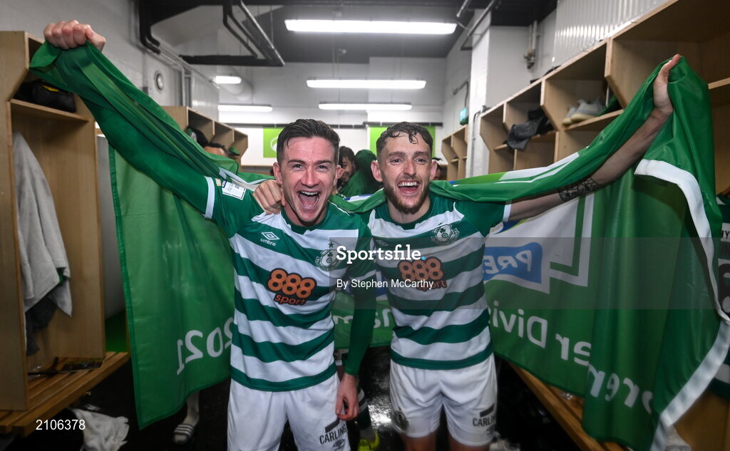 29 October 2021; Ronan Finn, left, and Lee Grace of Shamrock Rovers celebrate after the SSE Airtricity League Premier Division match between Shamrock Rovers and Finn Harps at Tallaght Stadium in Dublin. Photo by Stephen McCarthy/Sportsfile