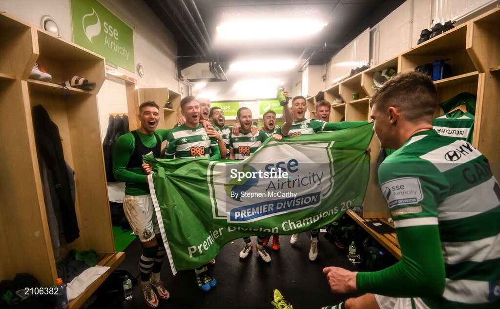 29 October 2021; Shamrock Rovers players celebrate in the dressing room after the SSE Airtricity League Premier Division match between Shamrock Rovers and Finn Harps at Tallaght Stadium in Dublin. Photo by Stephen McCarthy/Sportsfile