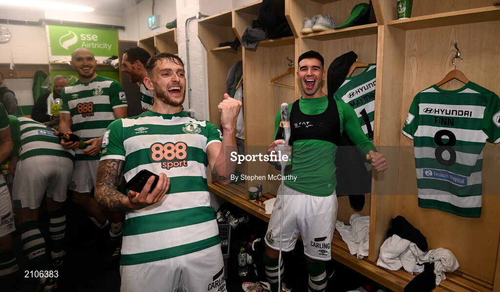29 October 2021; Shamrock Rovers players Lee Grace, left, and Danny Mandroiu celebrate in the dressing room after the SSE Airtricity League Premier Division match between Shamrock Rovers and Finn Harps at Tallaght Stadium in Dublin. Photo by Stephen McCarthy/Sportsfile
