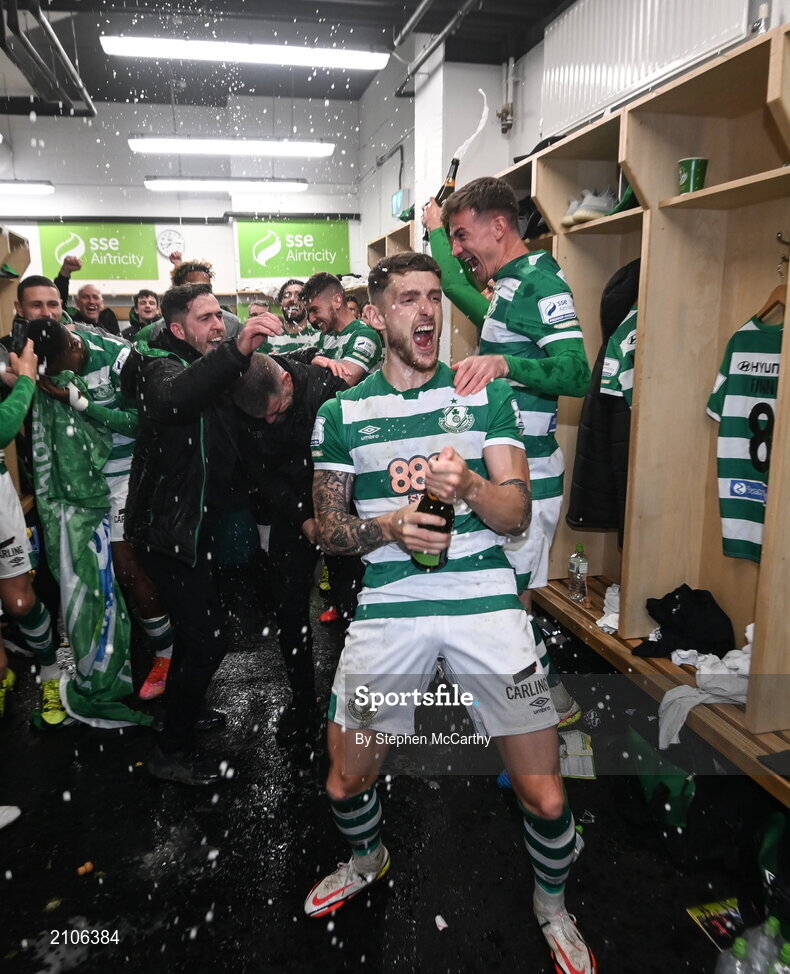 29 October 2021; Lee Grace of Shamrock Rovers and his manager Stephen Bradley celebrate in the dressingroom after the SSE Airtricity League Premier Division match between Shamrock Rovers and Finn Harps at Tallaght Stadium in Dublin. Photo by Stephen McCarthy/Sportsfile