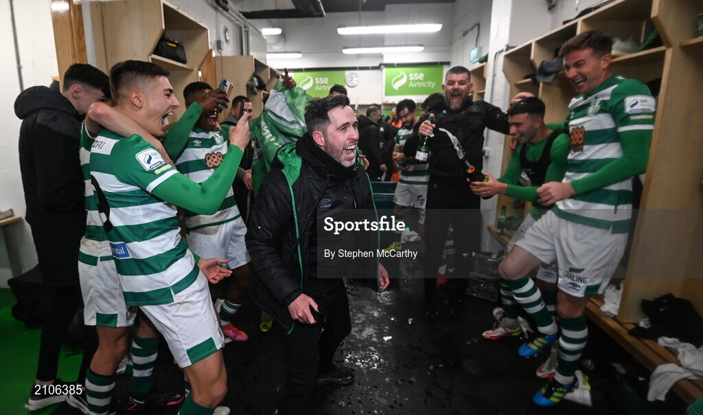 29 October 2021; Shamrock Rovers manager Stephen Bradley celebrate with his players in the dressingroom after the SSE Airtricity League Premier Division match between Shamrock Rovers and Finn Harps at Tallaght Stadium in Dublin. Photo by Stephen McCarthy/Sportsfile