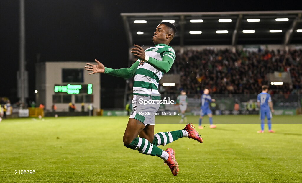 29 October 2021; Aidomo Emakhu of Shamrock Rovers celebrates after scoring his side's third goal during the SSE Airtricity League Premier Division match between Shamrock Rovers and Finn Harps at Tallaght Stadium in Dublin. Photo by Stephen McCarthy/Sportsfile