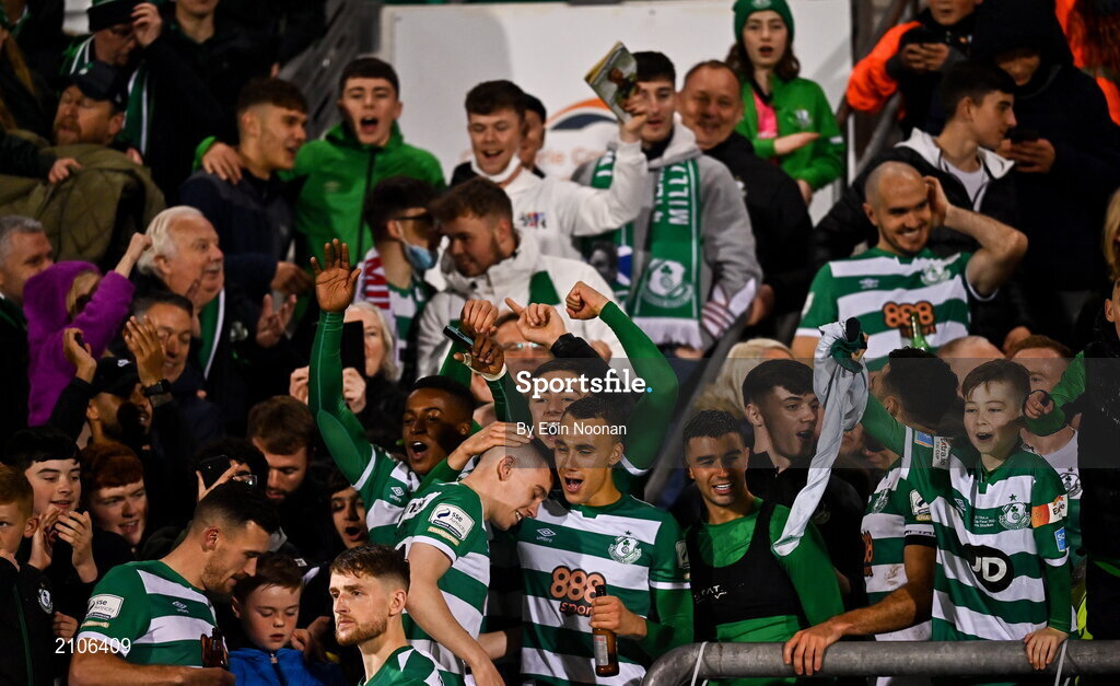 29 October 2021; Graham Burke of Shamrock Rovers, centre, celebrates with team-mates and supporters after the SSE Airtricity League Premier Division match between Shamrock Rovers and Finn Harps at Tallaght Stadium in Dublin. Photo by Eóin Noonan/Sportsfile