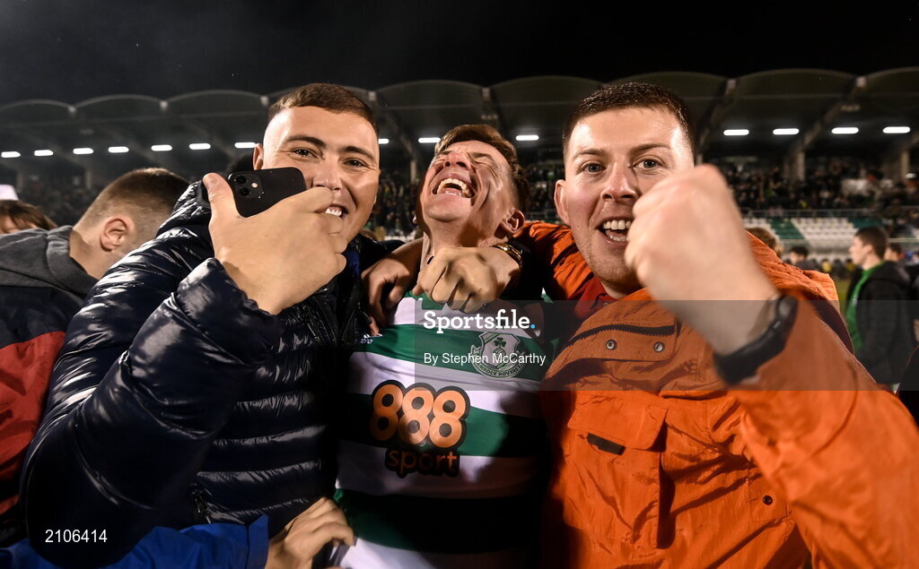 29 October 2021; Ronan Finn of Shamrock Rovers celebrates amongst supporters after the SSE Airtricity League Premier Division match between Shamrock Rovers and Finn Harps at Tallaght Stadium in Dublin. Photo by Stephen McCarthy/Sportsfile