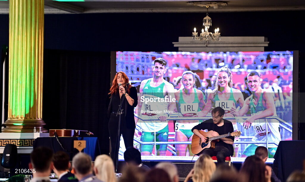 29 October 2021; The athletes and staff who represented Team Ireland at Tokyo 2020 this summer were formally congratulated at the Official Team Ireland Homecoming in Dublin Castle. A record number of Irish athletes competed at the Summer Olympics in Japan with 116 athletes competing across nineteen sports. An Taoiseach Michéal Martin TD, Minister Catherine Martin TD, Minister of State Jack Chambers TD and His Excellency Ambassador Extraordinary and Plenipotentiary of Japan to Ireland, Mr Mitsuru Kitano attended the event to honour the athletes. Performing at the homecoming is singer Roisín O. Photo by Brendan Moran/Sportsfile