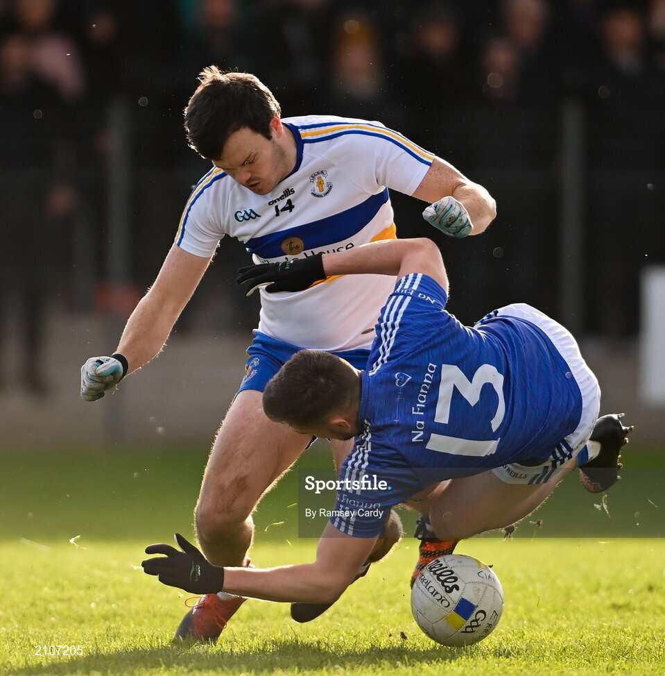 31 October 2021; Bryan Horisk of Errigal Ciaran in action against Cormac O'Hagan of Coalisland during the Tyrone County Senior Football Championship Semi-Final match between Errigal Ciaran and Coalisland at Pomeroy Plunkett's GAA Club in Tyrone. Photo by Ramsey Cardy/Sportsfile