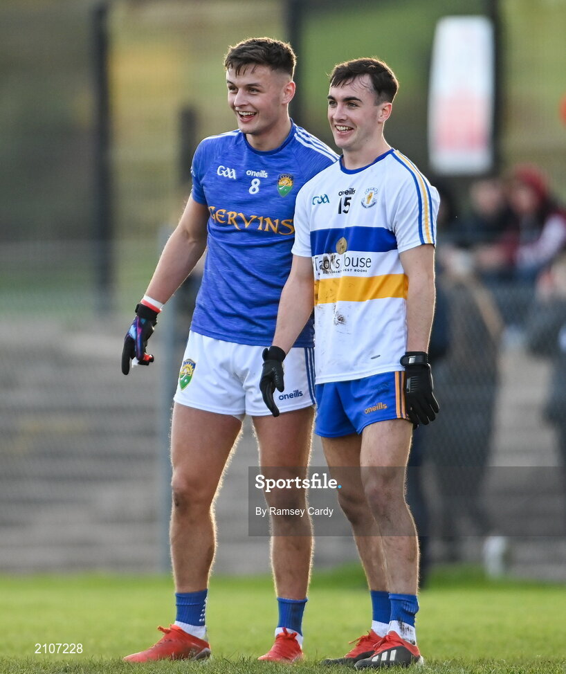 31 October 2021; Michael McKernan of Coalisland and Darragh Canavan of Errigal Ciaran during the Tyrone County Senior Football Championship Semi-Final match between Errigal Ciaran and Coalisland at Pomeroy Plunkett's GAA Club in Tyrone. Photo by Ramsey Cardy/Sportsfile