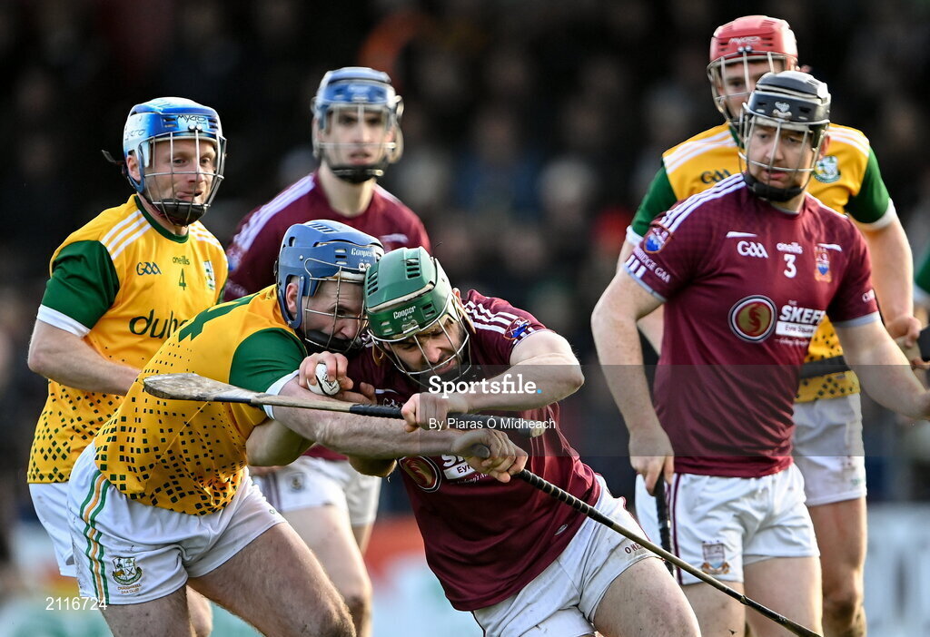 6 November 2021; Christy Bannon of Clarinbridge is tackled by Jamie Ryan of Craughwell during the Galway County Senior Club Hurling Championship semi-final match between Craughwell and Clarinbridge at Kenny Park in Athenry, Galway. Photo by Piaras Ó Mídheach/Sportsfile