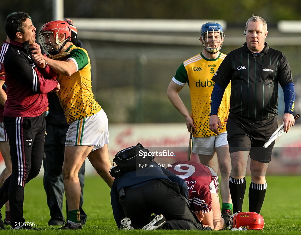 6 November 2021; Niall Healy of Craughwell tussles with Clarinbridge substitute Alan Kerins, far left, before Healy was shown a straight red card by referee Conor Quinlan during the Galway County Senior Club Hurling Championship semi-final match between Craughwell and Clarinbridge at Kenny Park in Athenry, Galway. Photo by Piaras Ó Mídheach/Sportsfile