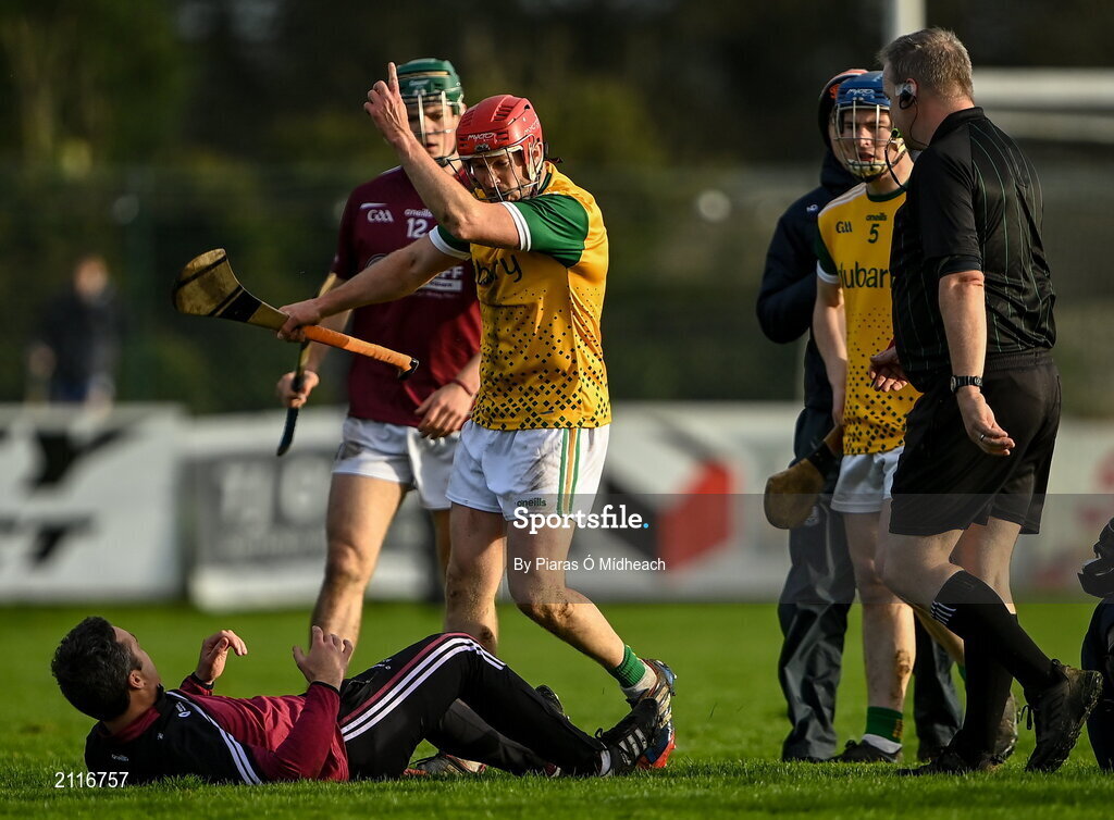 6 November 2021; Niall Healy of Craughwell in conversation with Clarinbridge substitute Alan Kerins, on the ground, before Healy was shown a straight red card by referee Conor Quinlan during the Galway County Senior Club Hurling Championship semi-final match between Craughwell and Clarinbridge at Kenny Park in Athenry, Galway. Photo by Piaras Ó Mídheach/Sportsfile