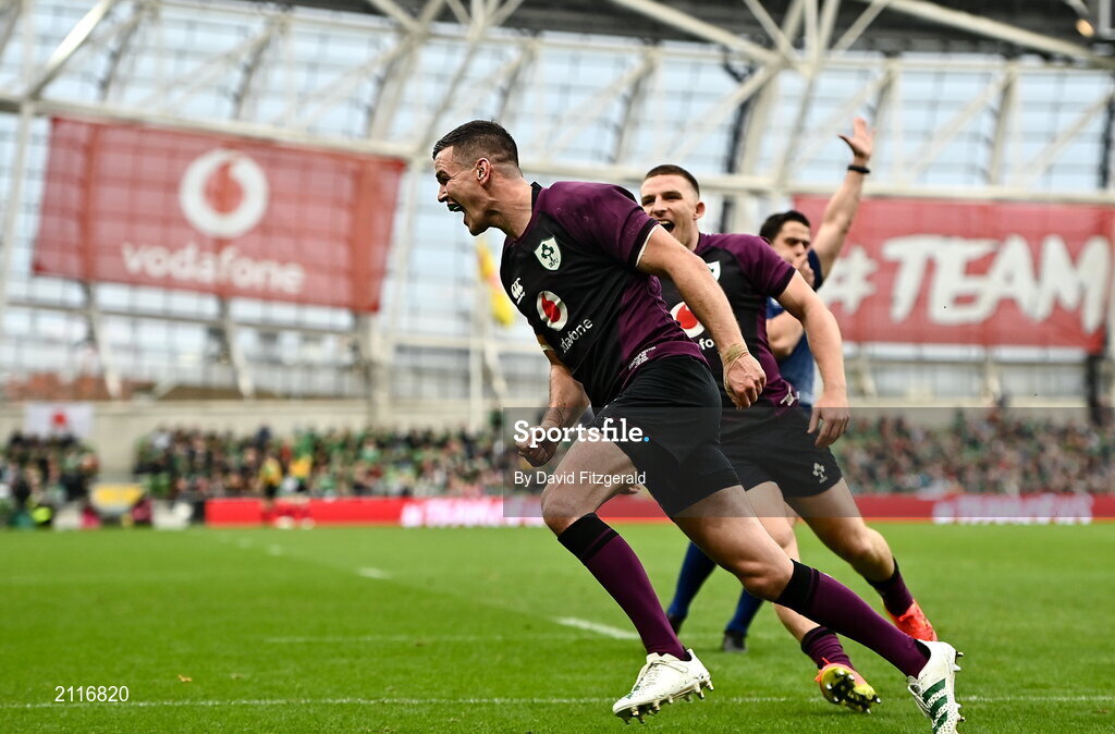 6 November 2021; Jonathan Sexton of Ireland celebrates after scoring his side's fifth try during the Autumn Nations Series match between Ireland and Japan at Aviva Stadium in Dublin. Photo by David Fitzgerald/Sportsfile