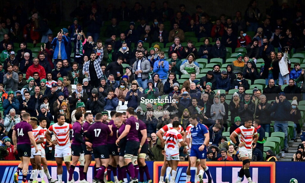 6 November 2021; Supporters cheer on after Garry Ringrose scored a try during the Autumn Nations Series match between Ireland and Japan at Aviva Stadium in Dublin. Photo by Brendan Moran/Sportsfile