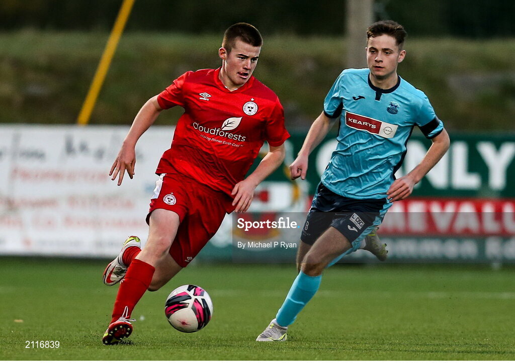 6 November 2021; Luke Browne of Shelbourne in action against Louis Allman of Cobh Ramblers during the EA SPORTS U17 National League of Ireland Shield Final match between Shelbourne and Cobh Ramblers at Athlone Town Stadium in Athlone, Westmeath. Photo by Michael P Ryan/Sportsfile