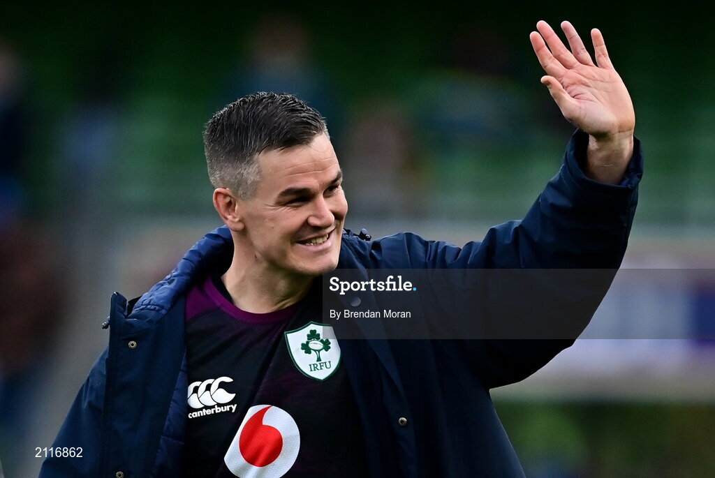 6 November 2021; Jonathan Sexton of Ireland waves to his family after the Autumn Nations Series match between Ireland and Japan at Aviva Stadium in Dublin. Photo by Brendan Moran/Sportsfile