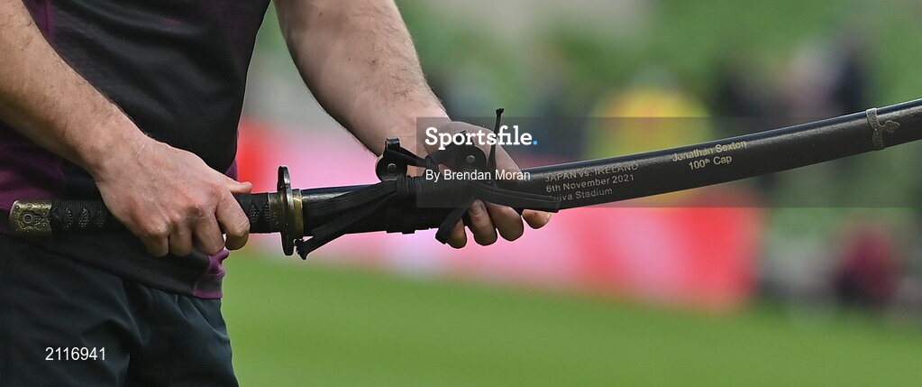 6 November 2021; Detailed view of the Katana presented to Ireland captain Jonathan Sexton on the occasion of earning his 100th cap for his country after the Autumn Nations Series match between Ireland and Japan at Aviva Stadium in Dublin. Photo by Brendan Moran/Sportsfile