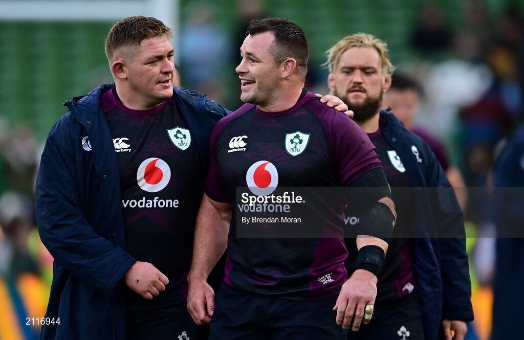 6 November 2021; Tadhg Furlong, left, and Cian Healy of Ireland after the Autumn Nations Series match between Ireland and Japan at Aviva Stadium in Dublin. Photo by Brendan Moran/Sportsfile