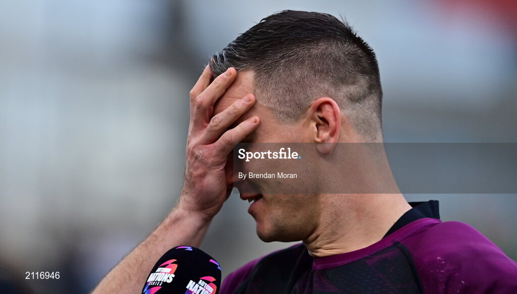 6 November 2021; An emotional Ireland captain Jonathan Sexton is interviewed after the Autumn Nations Series match between Ireland and Japan at Aviva Stadium in Dublin. Photo by Brendan Moran/Sportsfile