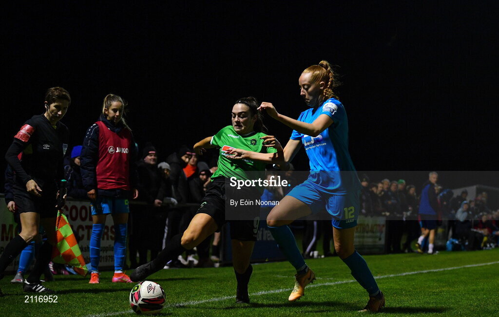 6 November 2021; Hannah McEvoy of Peamount United in action against Niamh Prior of DLR Waves during the SSE Airtricity Women's National League match between Peamount United and DLR Waves at PLR Park in Greenogue, Dublin. Photo by Eóin Noonan/Sportsfile