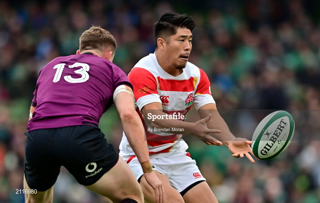 6 November 2021; Rikiya Matsuda of Japan in action against Garry Ringrose of Ireland during the Autumn Nations Series match between Ireland and Japan at Aviva Stadium in Dublin. Photo by Brendan Moran/Sportsfile