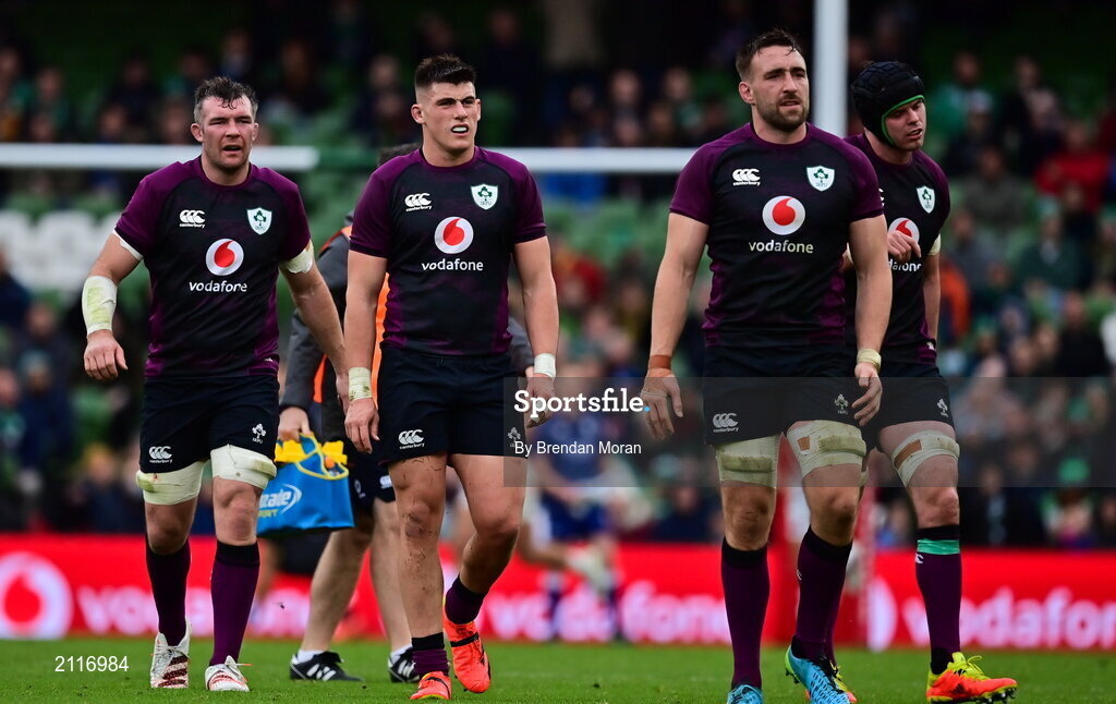 6 November 2021; Dan Sheehan of Ireland, 2nd from left, with team-mates Peter O’Mahony and Jack Conan, during the Autumn Nations Series match between Ireland and Japan at Aviva Stadium in Dublin. Photo by Brendan Moran/Sportsfile