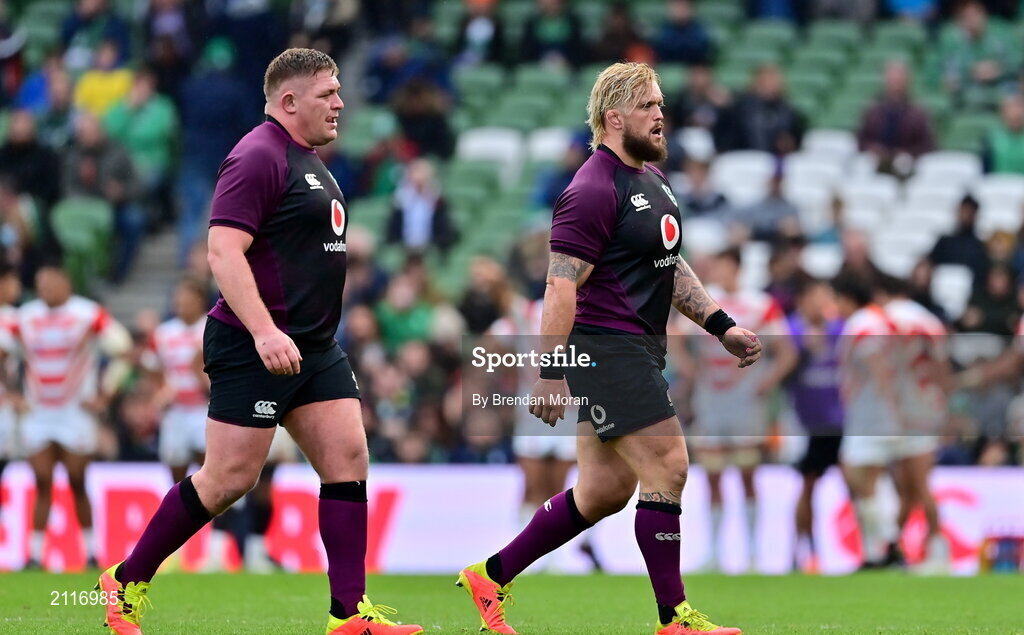 6 November 2021; Ireland forwards Tadhg Furlong, left, and Andrew Porter leave the pitch on being substituted during the Autumn Nations Series match between Ireland and Japan at Aviva Stadium in Dublin. Photo by Brendan Moran/Sportsfile
