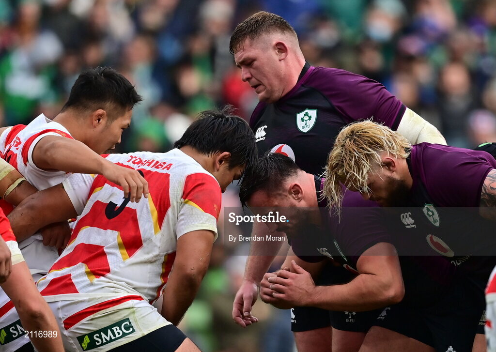 6 November 2021; Ireland front row forwards, from right, Andrew Porter, Ronán Kelleher and Tadhg Furlong during the Autumn Nations Series match between Ireland and Japan at Aviva Stadium in Dublin. Photo by Brendan Moran/Sportsfile
