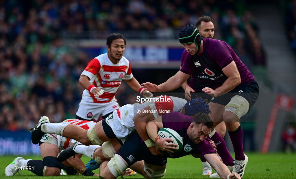 6 November 2021; Jack Conan of Ireland is tackled by James Moore of Japan during the Autumn Nations Series match between Ireland and Japan at Aviva Stadium in Dublin. Photo by Brendan Moran/Sportsfile