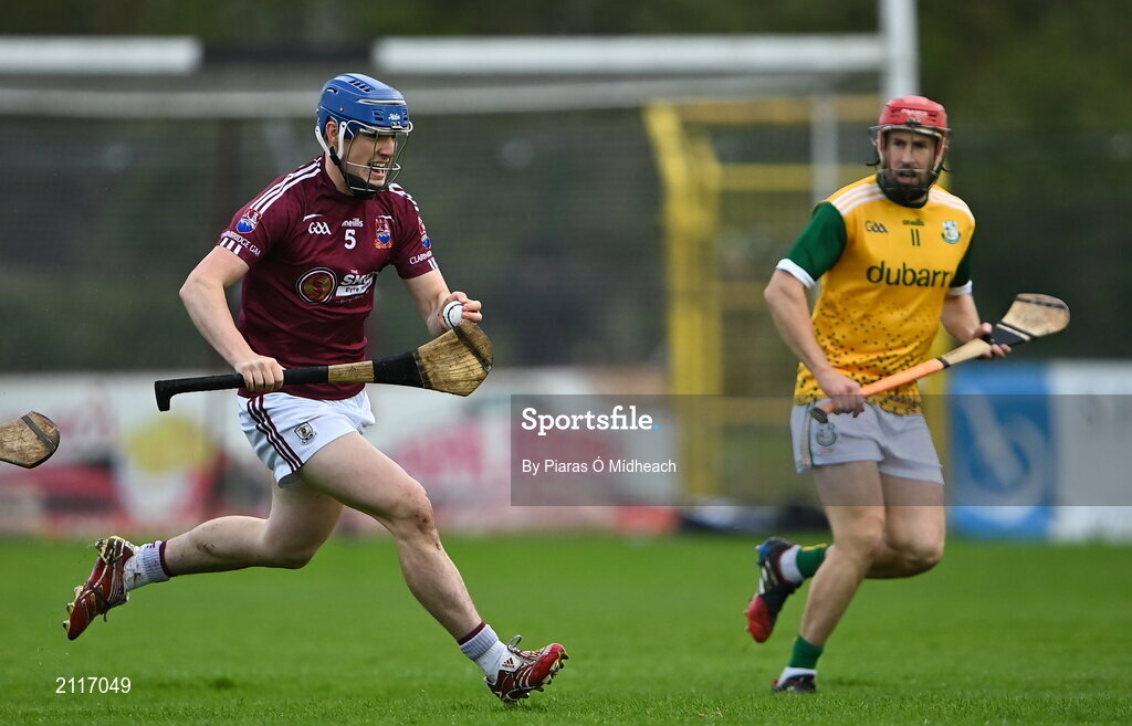 6 November 2021; Shane Ryan of Clarinbridge gets away from Niall Healy of Craughwell during the Galway County Senior Club Hurling Championship Semi-Final match between Craughwell and Clarinbridge at Kenny Park in Athenry, Galway. Photo by Piaras Ó Mídheach/Sportsfile