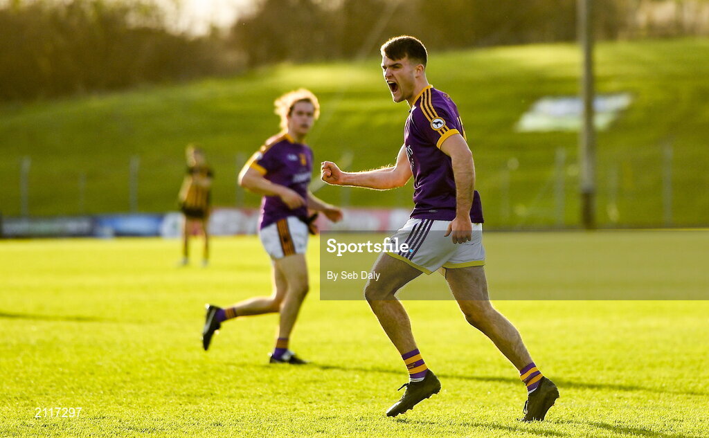 7 November 2021; Sarán Ó Fionnagáin of Wolfe Tones celebrates after kicking a point during the Meath County Senior Club Football Championship Final match between St Peter's Dunboyne and Wolfe Tones at Páirc Tailteann in Navan, Meath. Photo by Seb Daly/Sportsfile