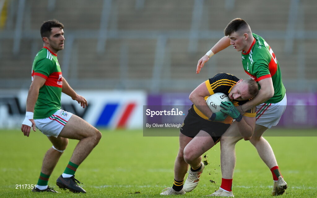 7 November 2021; Laurence Caffrey of Ramor United in action against Ryan Brady of Gowna during the Cavan County Senior Club Football Championship Final match between Gowna and Ramor United at Kingspan Breffni in Cavan. Photo by Oliver McVeigh/Sportsfile