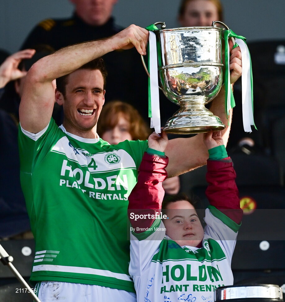 7 November 2021; Ballyhale Shamrocks captain Colin Fennelly lifts the Tom Walsh Cup with assistance from Jennifer Malone after the Kilkenny County Senior Club Hurling Championship Final match between Ballyhale Shamrocks and O'Loughlin Gaels at UPMC Nowlan Park in Kilkenny. Photo by Brendan Moran/Sportsfile