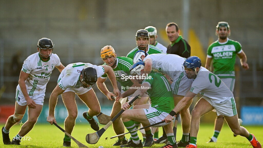 7 November 2021; TJ Reid, no 11, and Colin Fennelly of Ballyhale Shamrocks tussle for possession with O'Loughlin Gaels players, from left, Mikey Butler, Conor Heary, Huw Lawlor and Danny Loughnane during the Kilkenny County Senior Club Hurling Championship Final match between Ballyhale Shamrocks and O'Loughlin Gaels at UPMC Nowlan Park in Kilkenny. Photo by Brendan Moran/Sportsfile