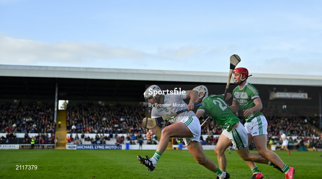 7 November 2021; Mark Bergin of O'Loughlin Gaels gets away from Kevin Mullen and Adrian Mullen of Ballyhale Shamrocks during the Kilkenny County Senior Club Hurling Championship Final match between Ballyhale Shamrocks and O'Loughlin Gaels at UPMC Nowlan Park in Kilkenny. Photo by Brendan Moran/Sportsfile