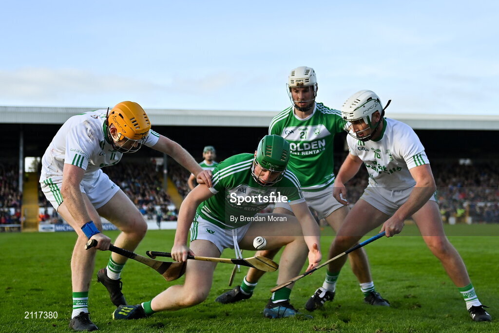 7 November 2021; Evan Shefflin of Ballyhale Shamrocks gathers possession under pressire from Paddy Butler, left, and Mark Bergin of O'Loughlin Gaels during the Kilkenny County Senior Club Hurling Championship Final match between Ballyhale Shamrocks and O'Loughlin Gaels at UPMC Nowlan Park in Kilkenny. Photo by Brendan Moran/Sportsfile