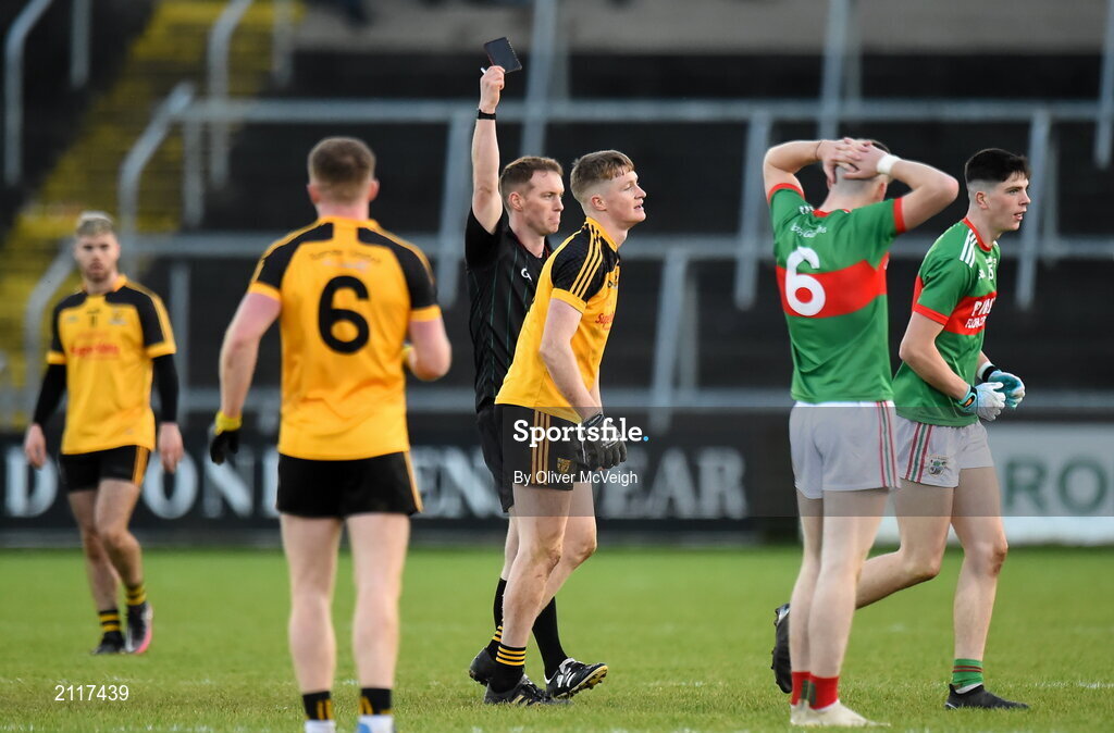 7 November 2021; Referee Pat Clarke issues a late black card to Enda Maguire of Ramor United during the Cavan County Senior Club Football Championship Final match between Gowna and Ramor United at Kingspan Breffni in Cavan. Photo by Oliver McVeigh/Sportsfile