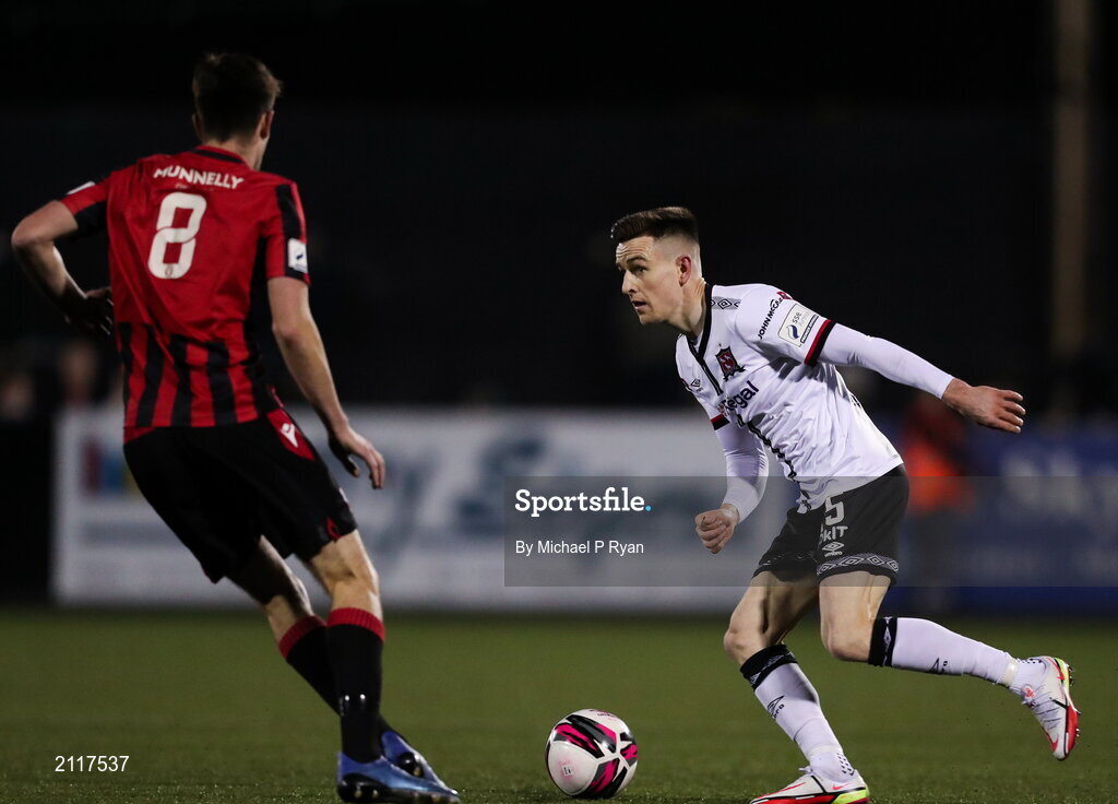 7 November 2021; Darragh Leahy of Dundalk in action against Rob Manley of Longford Town during the SSE Airtricity League Premier Division match between Dundalk and Longford Town at Oriel Park in Dundalk, Louth. Photo by Michael P Ryan/Sportsfile