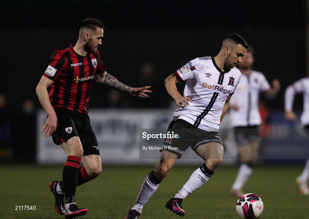 7 November 2021; Michael Duffy of Dundalk in action against Shane Elworthy of Longford Town during the SSE Airtricity League Premier Division match between Dundalk and Longford Town at Oriel Park in Dundalk, Louth. Photo by Michael P Ryan/Sportsfile