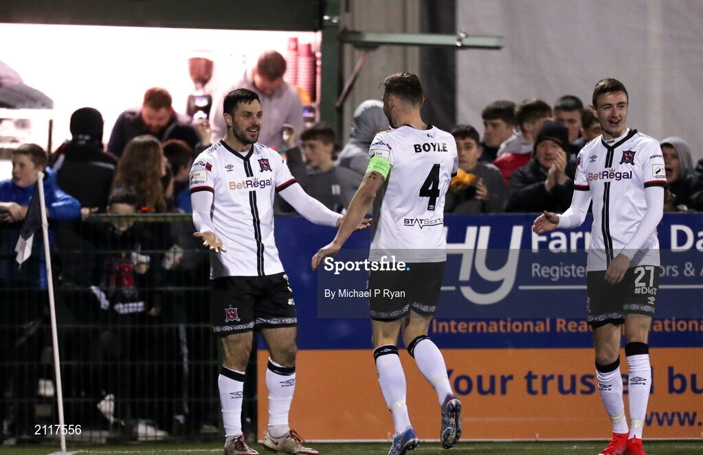 7 November 2021; Patrick Hoban of Dundalk, left, celebrates with team-mates after scoring his side's first goal during the SSE Airtricity League Premier Division match between Dundalk and Longford Town at Oriel Park in Dundalk, Louth. Photo by Michael P Ryan/Sportsfile