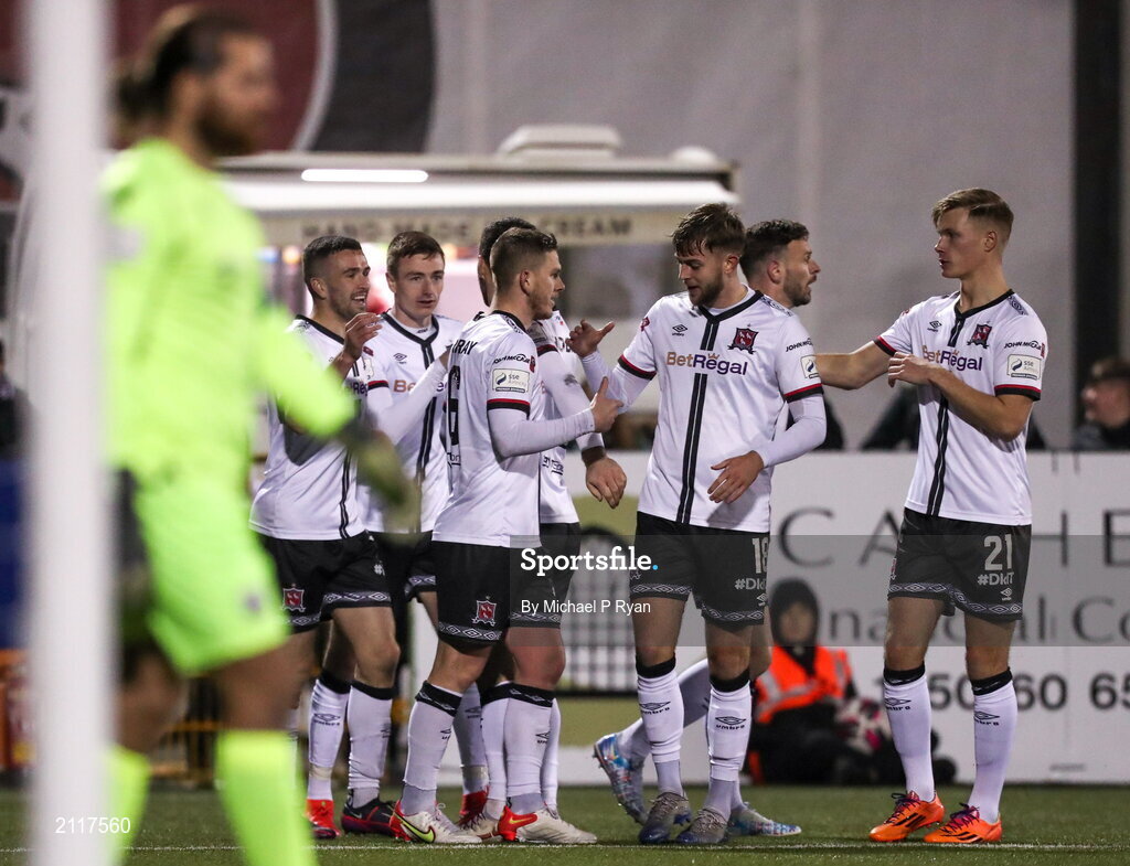 7 November 2021; Sean Murray of Dundalk, centre, celebrates with team-mates after scoring his side's second goal during the SSE Airtricity League Premier Division match between Dundalk and Longford Town at Oriel Park in Dundalk, Louth. Photo by Michael P Ryan/Sportsfile