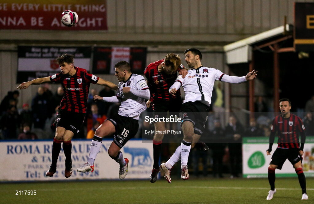 7 November 2021; Patrick Hoban of Dundalk heads to score his side's first goal during the SSE Airtricity League Premier Division match between Dundalk and Longford Town at Oriel Park in Dundalk, Louth. Photo by Michael P Ryan/Sportsfile