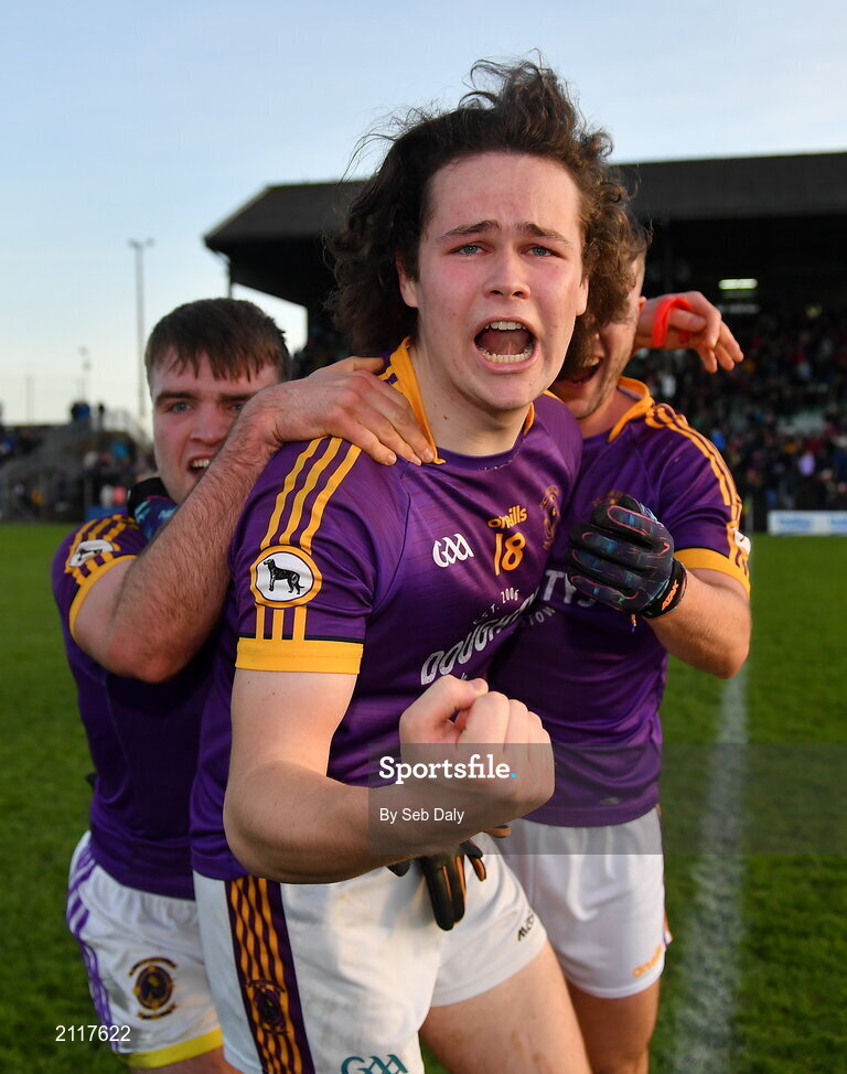 7 November 2021; Wolfe Tones players Oisín Martin, centre, Sarán Ó Fionnagáin, left, and Brughach Ó Fionnagáin celebrates after their side's victory in the Meath County Senior Club Football Championship Final match between St Peter's Dunboyne and Wolfe Tones at Páirc Tailteann in Navan, Meath. Photo by Seb Daly/Sportsfile