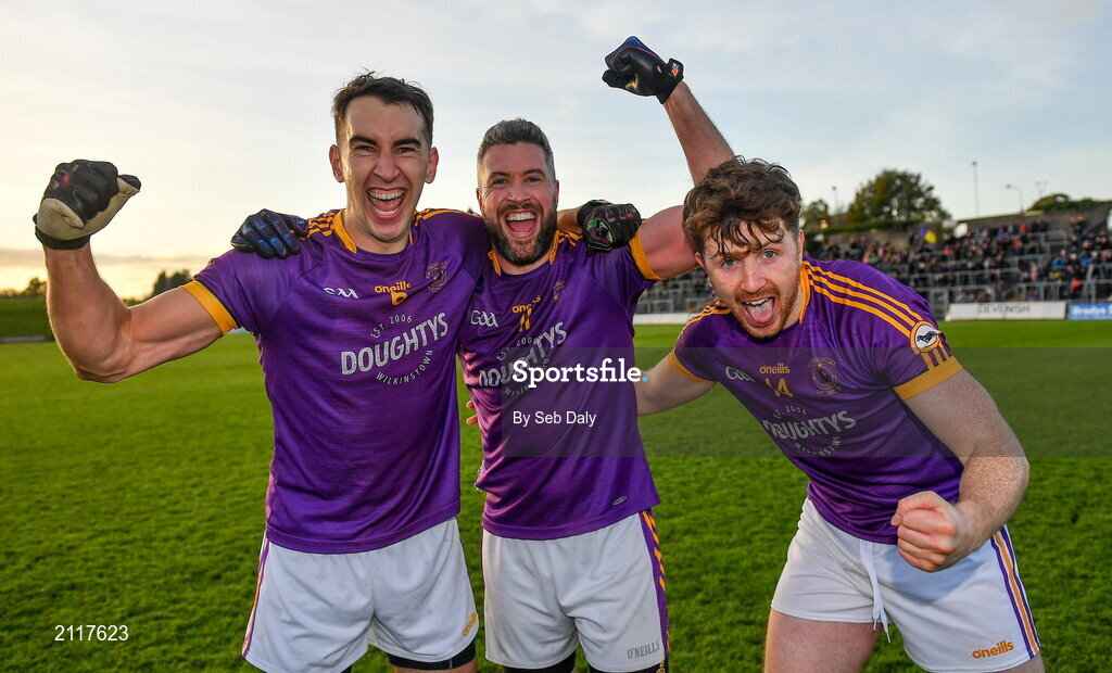 7 November 2021; Wolfe Tones players, from left, Shane Glynn, Cian Ward and Cian O’Neill celebrate after their side's victory in the Meath County Senior Club Football Championship Final match between St Peter's Dunboyne and Wolfe Tones at Páirc Tailteann in Navan, Meath. Photo by Seb Daly/Sportsfile