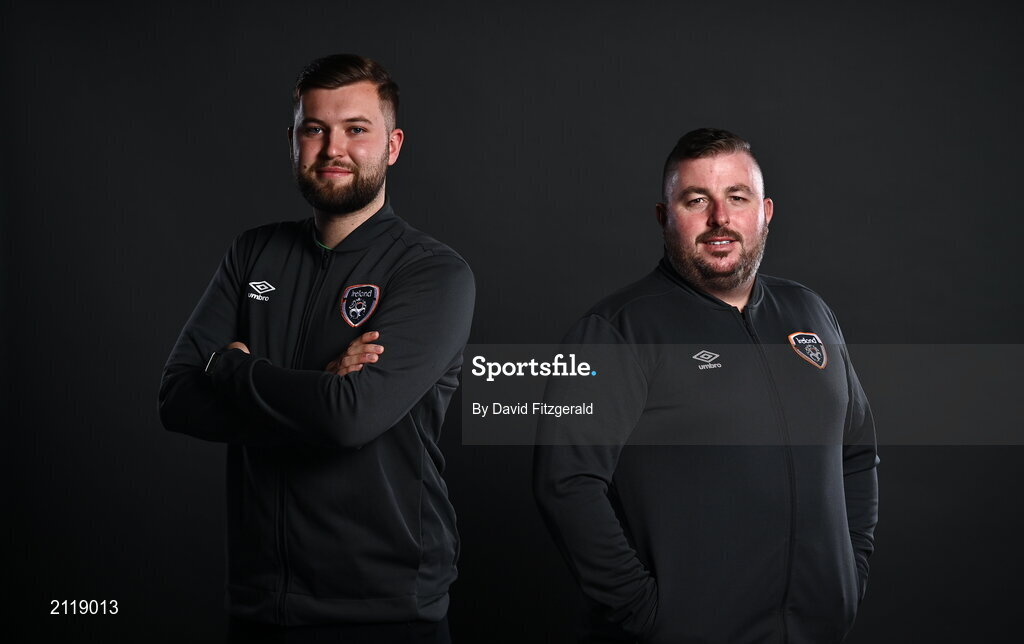 9 November 2021; Performance Analysts Aaron Roe, left, and Martin Doyle during a Republic of Ireland Men's U21 portrait session at the Carlton Hotel in Tyrrelstown, Dublin. Photo by David Fitzgerald/Sportsfile